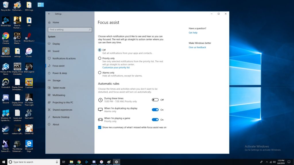 Sick of notifications throwing you off when you’re trying to work? Try Focus Assist. Go to settings, and under system settings you’ll find Focus Assist. This mode lets you set hours you’d like to silence notifications, and even lets you customize which notifications are high-priority. This functionality is similar to smartphones’ Do Not Disturb mode. It isn’t frequently used, though, as many people don’t even know that it’s there!