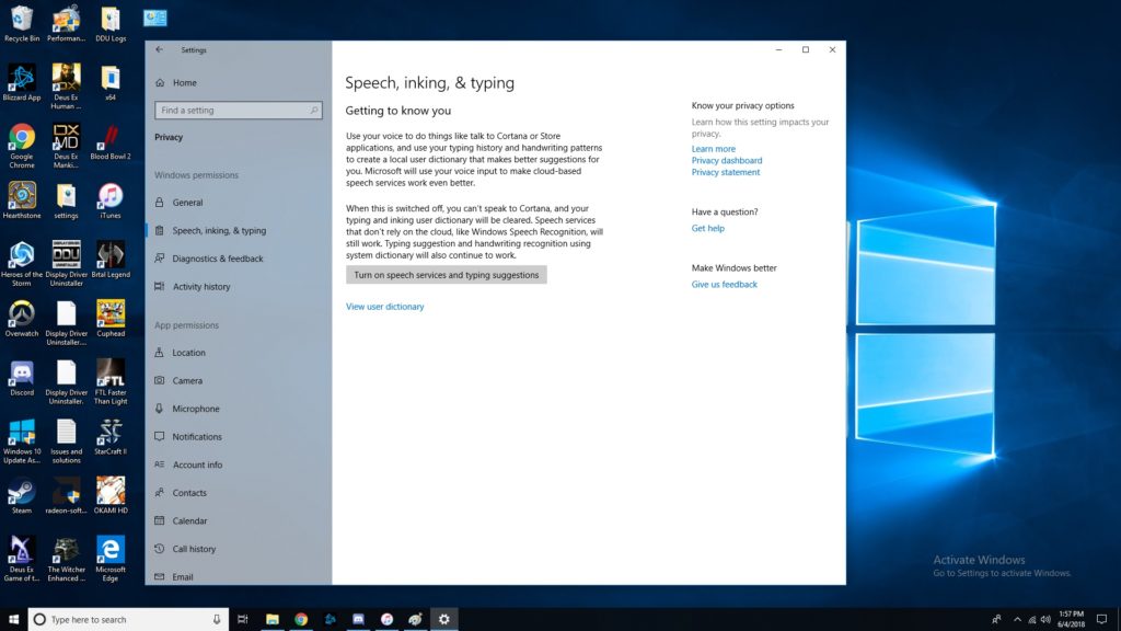 Dictation is super handy for a number of uses. For one, it’s good for when you just don’t feel like typing or feel like you can speak faster than type. More importantly, it’s a great accessibility tool for those unable to use a keyboard. In any event, enabling dictation is simple! Go to settings, then speech, then related settings. Then, click on “Speech, inking and typing privacy settings” and enable dictation. Boom, now we’re talking! Literally!