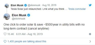 Elon Musk took to twitter early Sunday morning to pitch Tesla’s new solar rental program. Tesla’s sales pitch for choosing the rental option is that it will be cheaper, quicker, and less of a burden for homeowners to get solar panels on their roof.