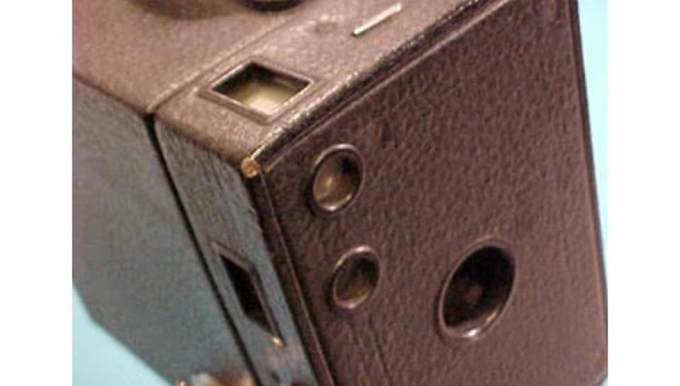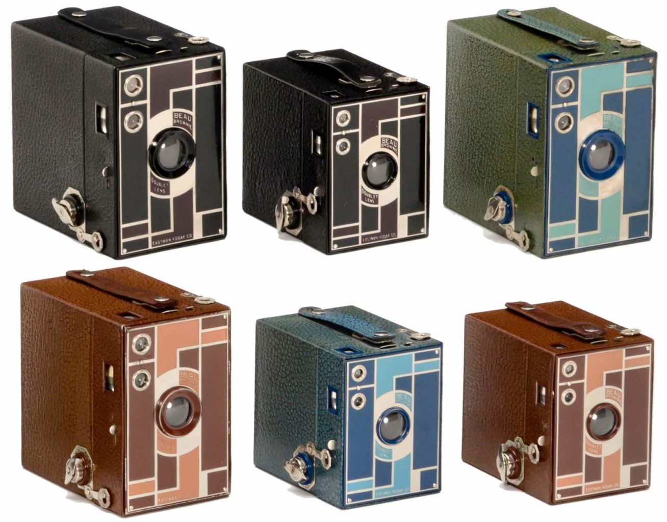 The Beau Brownie was a new version of the Brownie sold from 1930 to 1933. They had very little technical variation from the immensely popular Brownie cameras. With the only one big technical difference being the introduction of a new doublet lens, allowing the same picture to be projected on a film plate over a shorter distance and this made the Beau Brownies nearly 2″ shorter than their conventional counterparts. With an updated Art Deco design with an enameled two-tone front plate, it was a stunning example of period tech. It was produced in in five color combinations: black and burgundy, brown and tan, two-tone blue, two-tone green, and two-tone rose.